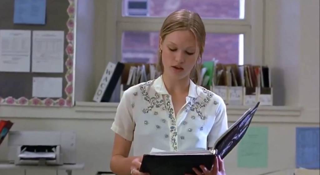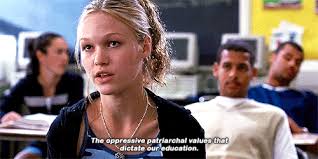 In the beginning of the movie, we see Kat speak up in English class about not having many women authored books on their syllabus.